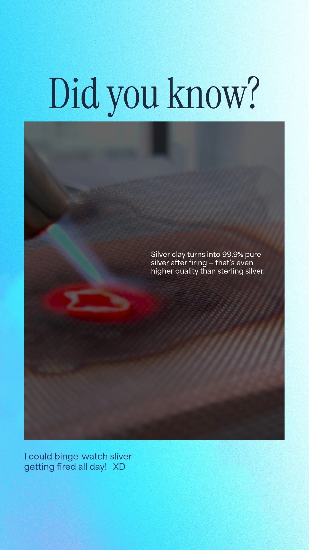 When fired, the binder burns away and fuses the silver particles into 99.9% pure silver, transforming a delicate clay form into a lasting piece of jewellery.